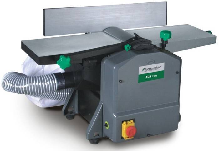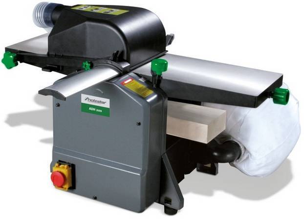 Строгальный вал закрыт защитным кожухом. Толщина снимаемой стружки устанавливается рукояткой и отображается на хорошо читаемой шкале; - ADH 200 - фуговально-рейсмусовый станок с шириной строгания 204 мм предназначен для углового фугования (наклон до 90°) и точного строгания твердой древесины и досок;