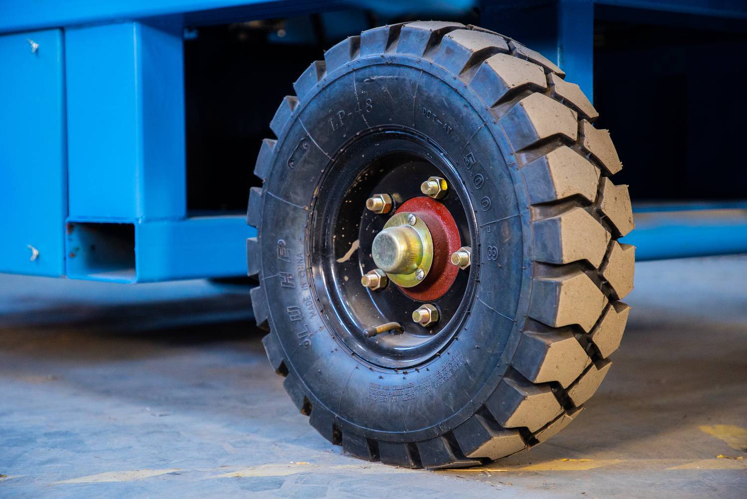 Передвижной ножничный подъемник TOR SJY DC. Модель оснащена аккумулятором, подъем площадки осуществляется за счет работы электромотора, передвижение за счет внешнего усилия.
