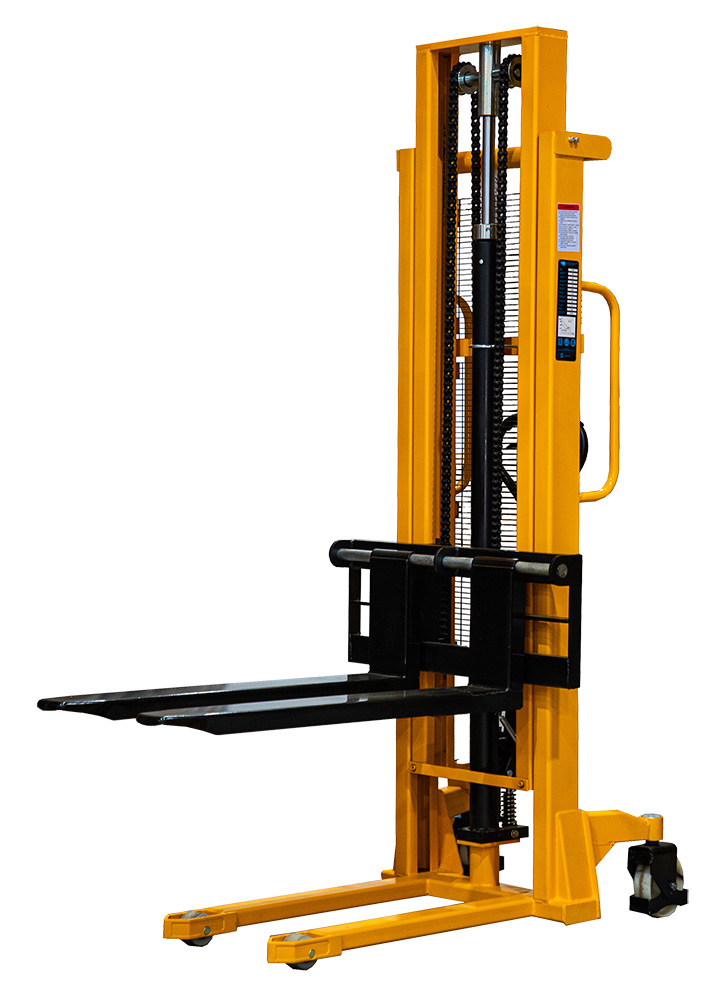 Раздвижные вилы позволяют обрабатывать грузы, которые помещены на нестандартные паллеты. Штабелер имеет функции как ручного подъема, так и ножного подъема (по средству специальной педали). Является идеальным решением для складов с малым грузопотоком.