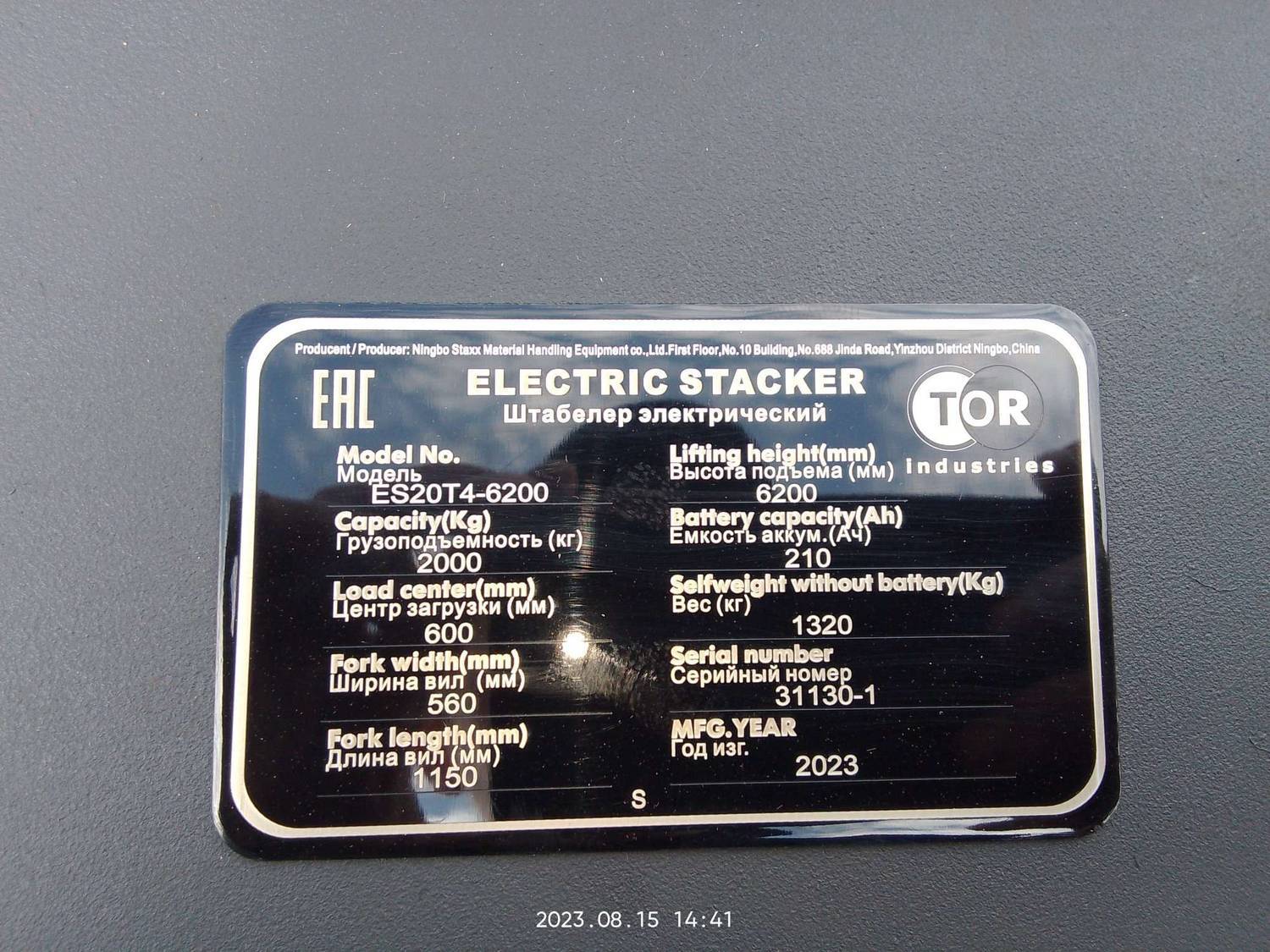 Штабелер самоходный 2,0 т 6,2 м TOR ES20T4 24/210 В/Ач ЭУР, Curtis, H-мачта (с платформой)