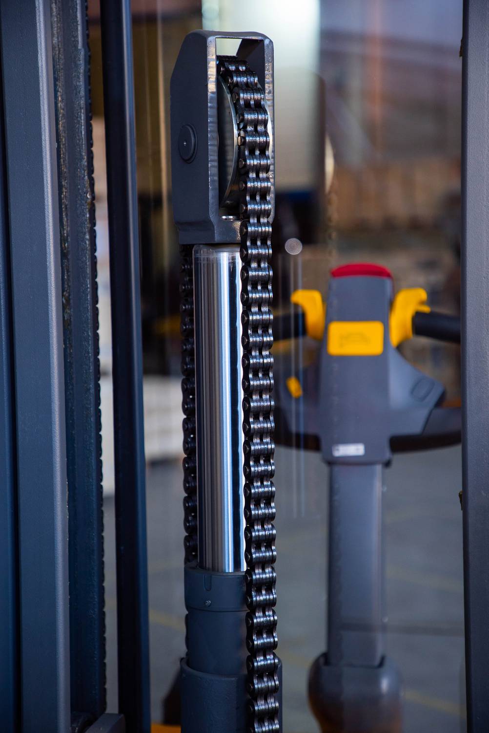 - Свободный ход мачты, подходит для помещений с низкими потолками. (Штабелер с высотой подъема 3м может войти в дверь 2м) Удобство обслуживания: