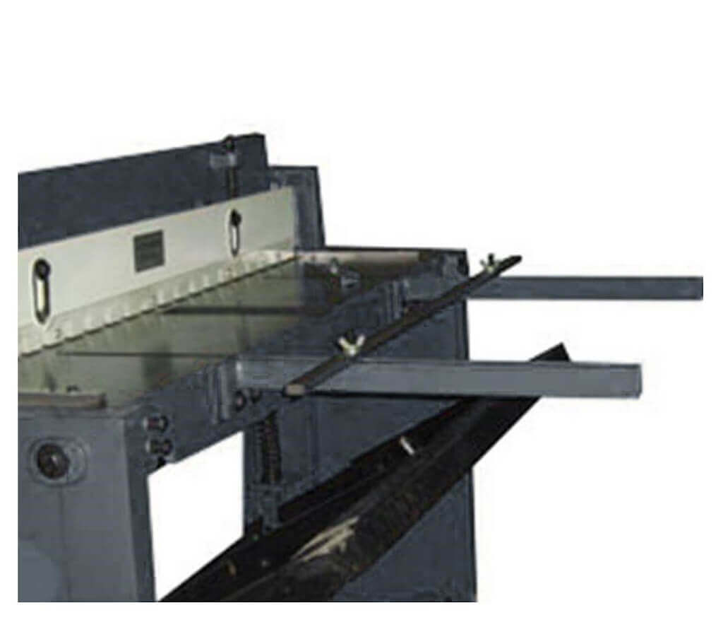 Рабочий стол гильотины снабжен с двух сторон упорами и линейками, облегчающими размещение заготовки. Для поддержки длинных листов гильотина снабжена выдвижным передним упором.