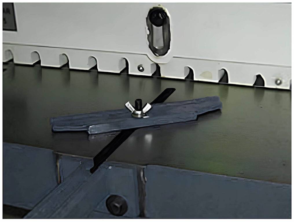 Рабочий стол снабжен боковыми упорами с двух сторон, по которым удобно выравнивать лист. На каждом упоре нанесена миллиметровая шкала, облегчающая позиционирование листа. Подвижная балка листогиба оснащена устройством защиты пальцев от повреждения. Стол гильотины имеет Т-образный паз, по которому перемещается упор для резки под углом.