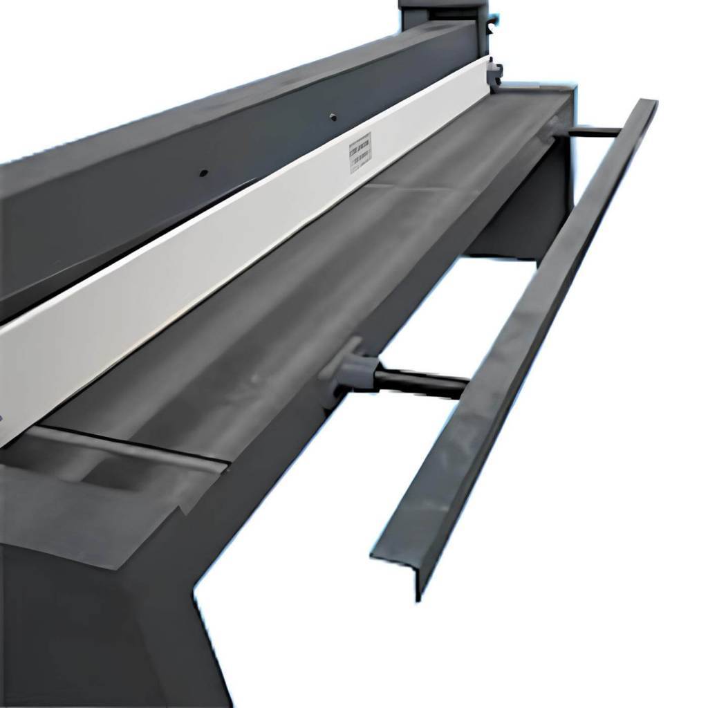 Рабочий стол гильотины снабжен с двух сторон упорами и линейками, облегчающими размещение заготовки. Для поддержки длинных листов гильотина снабжена выдвижным передним упором.