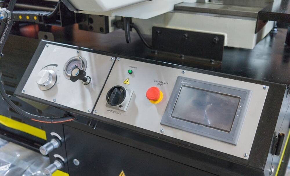 Панель управления встроена в тумбу станка. Длина подачи заготовки контролируется автоматически c ЧПУ (СNC). ЧПУ станка строится на PLC контроллере. Сенсорный дисплей управления.