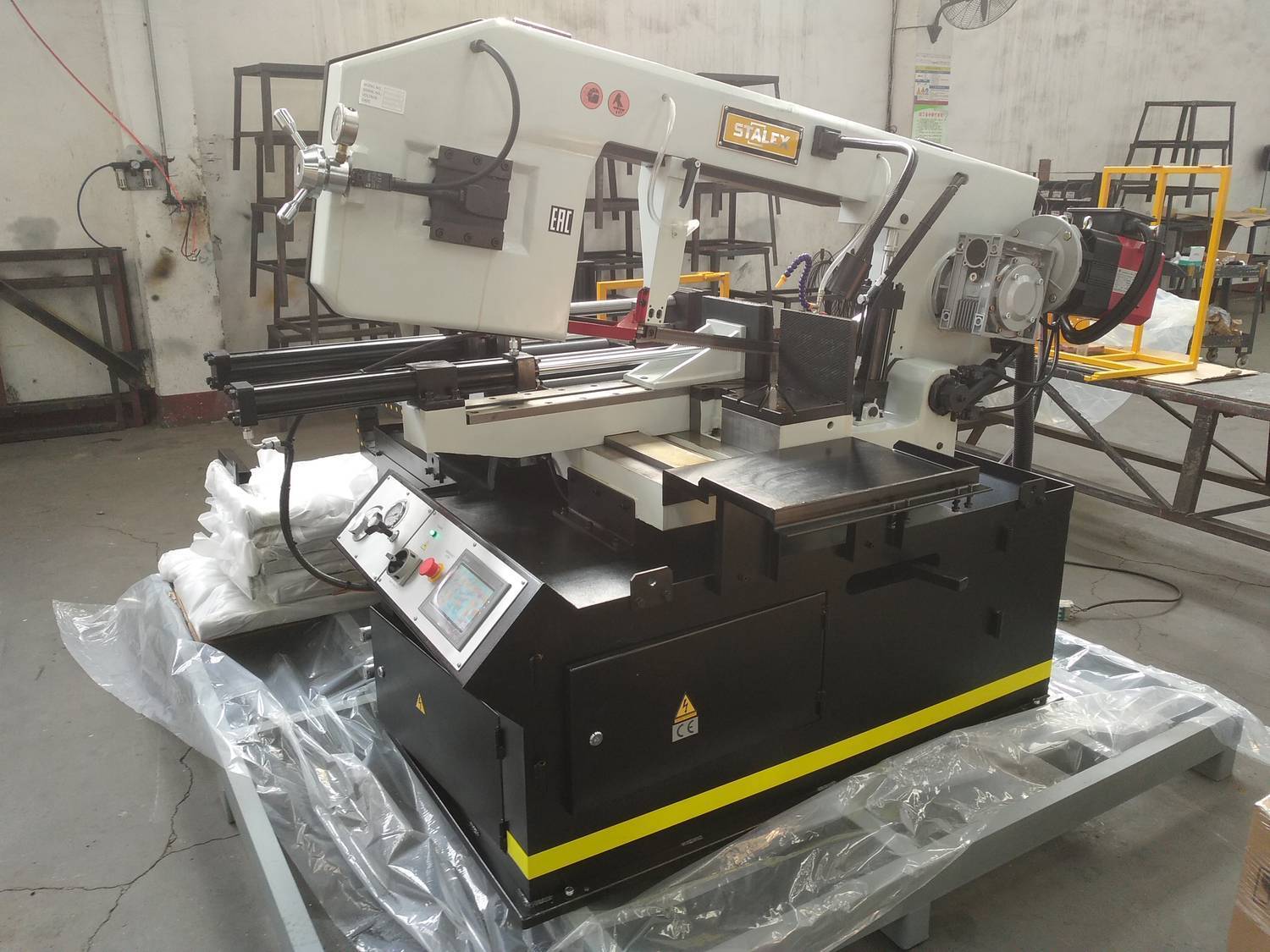 Автоматический ленточнопильный станок, предназначен для пиления труб максимальным диаметром 330 мм и прямоугольной профильной заготовки 460x250 мм под углом 90°.