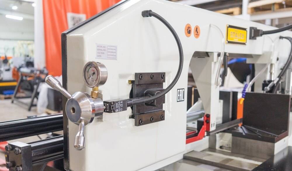 так и в автоматическом режиме, когда станок выполняет весь цикл резания (зажим заготовки – подвод заготовки – запуск пилы – опускание рамы – остановка пилы – подъем рамы – отжим тисков). В последнем случае оператор должен лишь обеспечить подачу заготовок, предварительно настроить концевой ограничитель на необходимую длину получаемых заготовок и запустить цикл пиления кнопкой «Пуск».