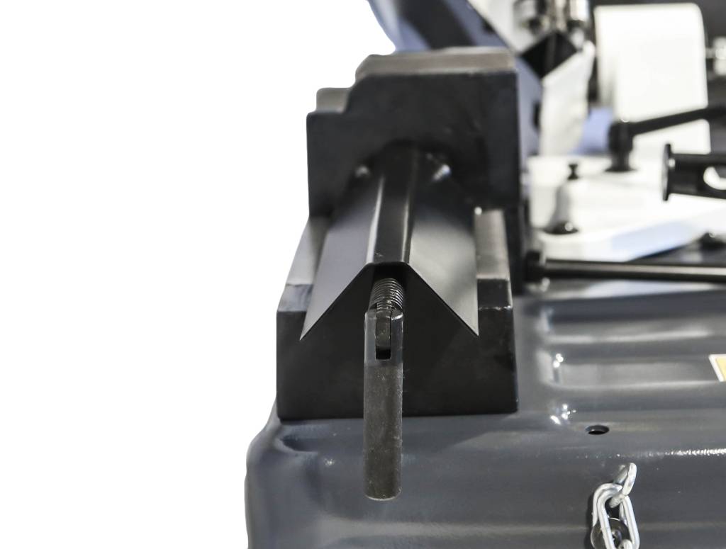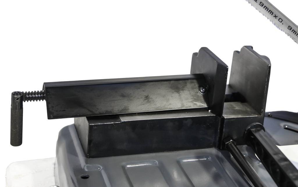 За надежное закрепление заготовки на станке отвечают механические тиски. Они приводятся в движение маховиком и надежно фиксируют заготовку. Губка тисков имеет рифленую поверхность, что препятствует самопроизвольному смещению заготовки при распиле.