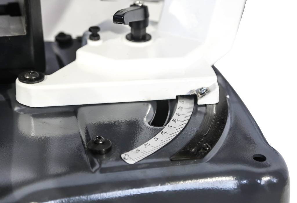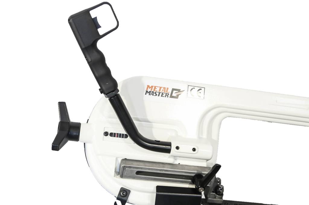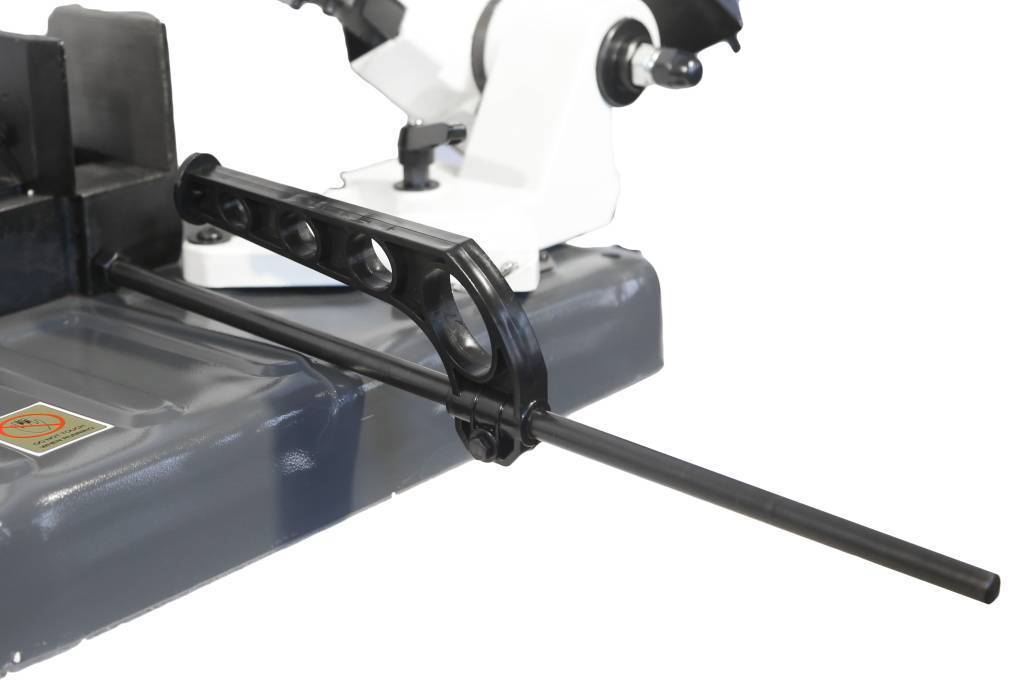 Metal Master BSM 150 имеет возможность поворота пильной рамы на угол 90° ;60° ; 45°. Рама отлита из серого чугуна, что позволяет обеспечить необходимую жесткость конструкции и гасить вибрации, возникающие при работе станка. Чтобы повернуть раму необходимо для начала ослабить данный рычаг.
