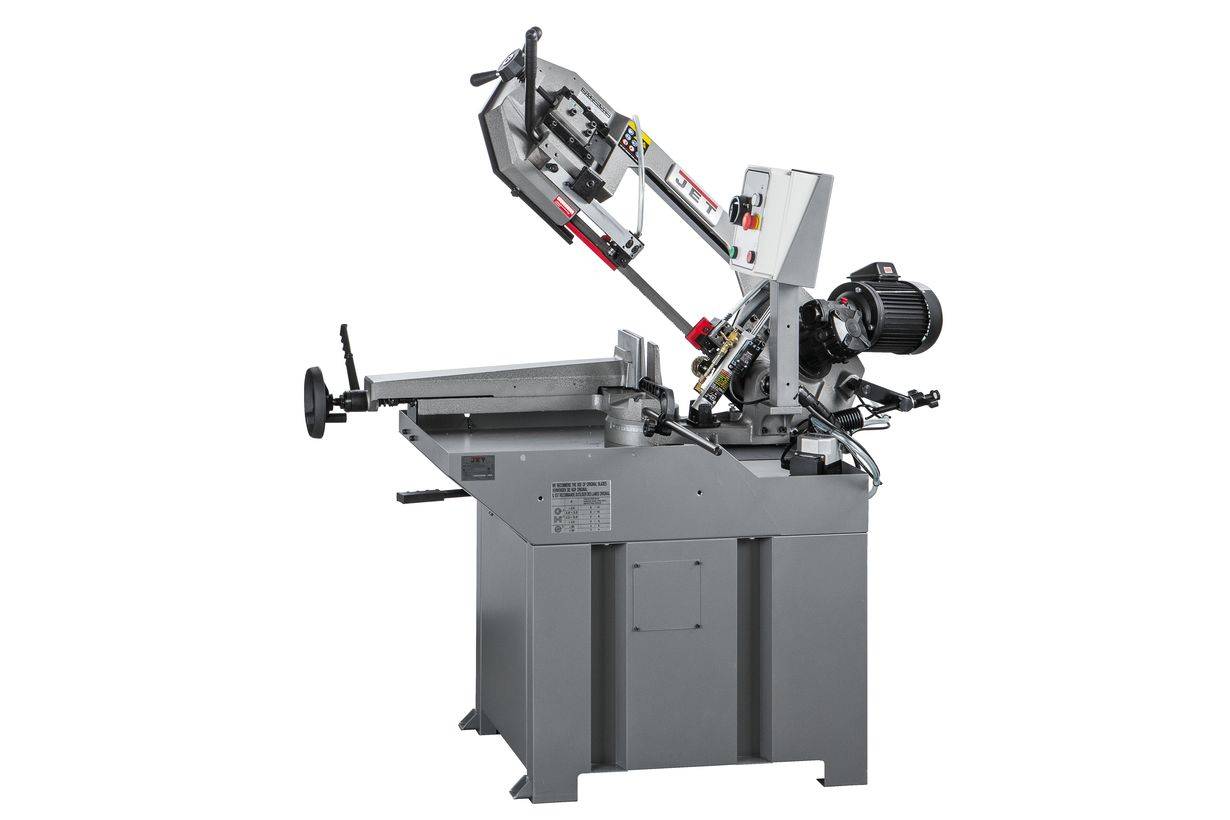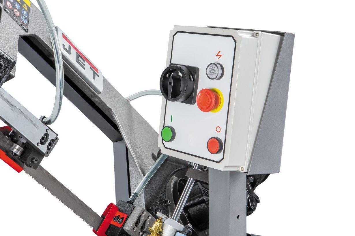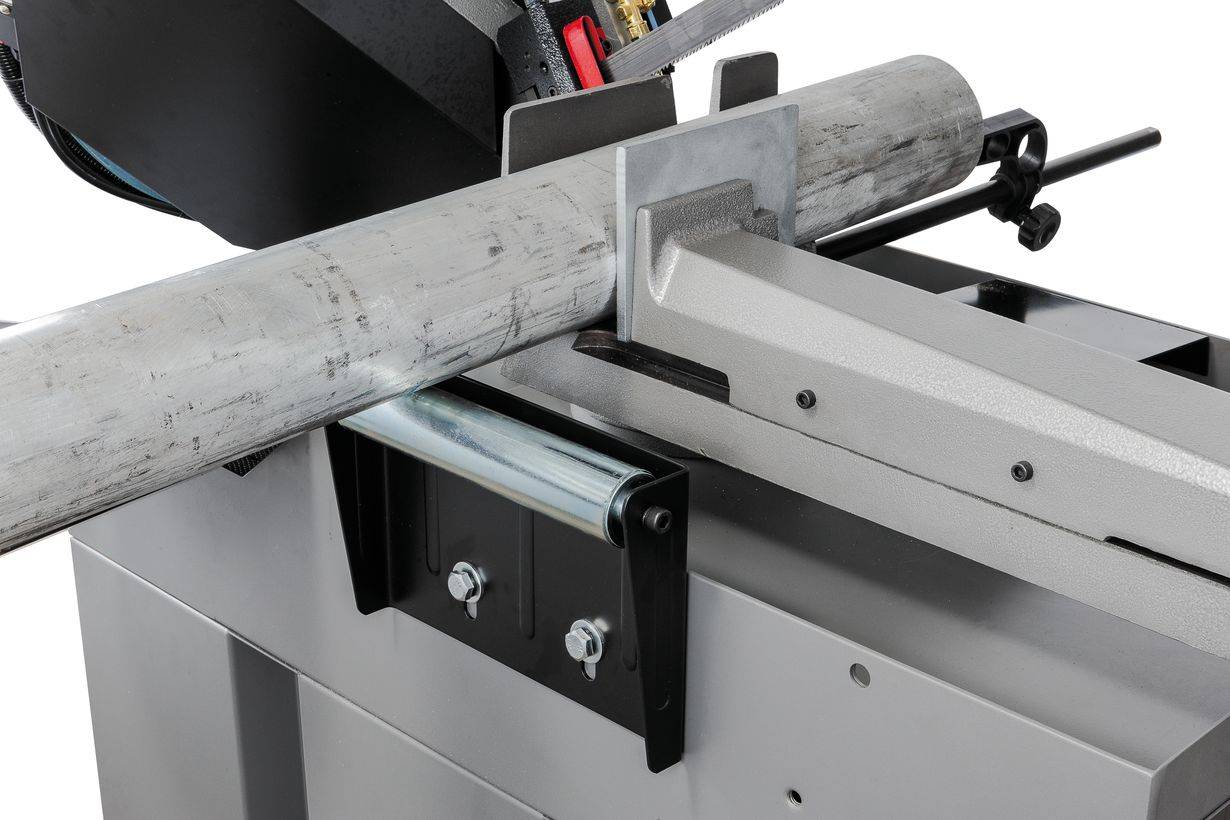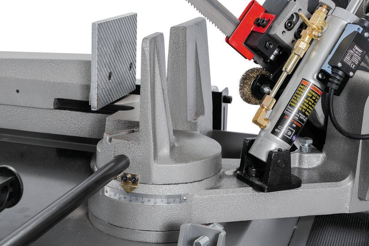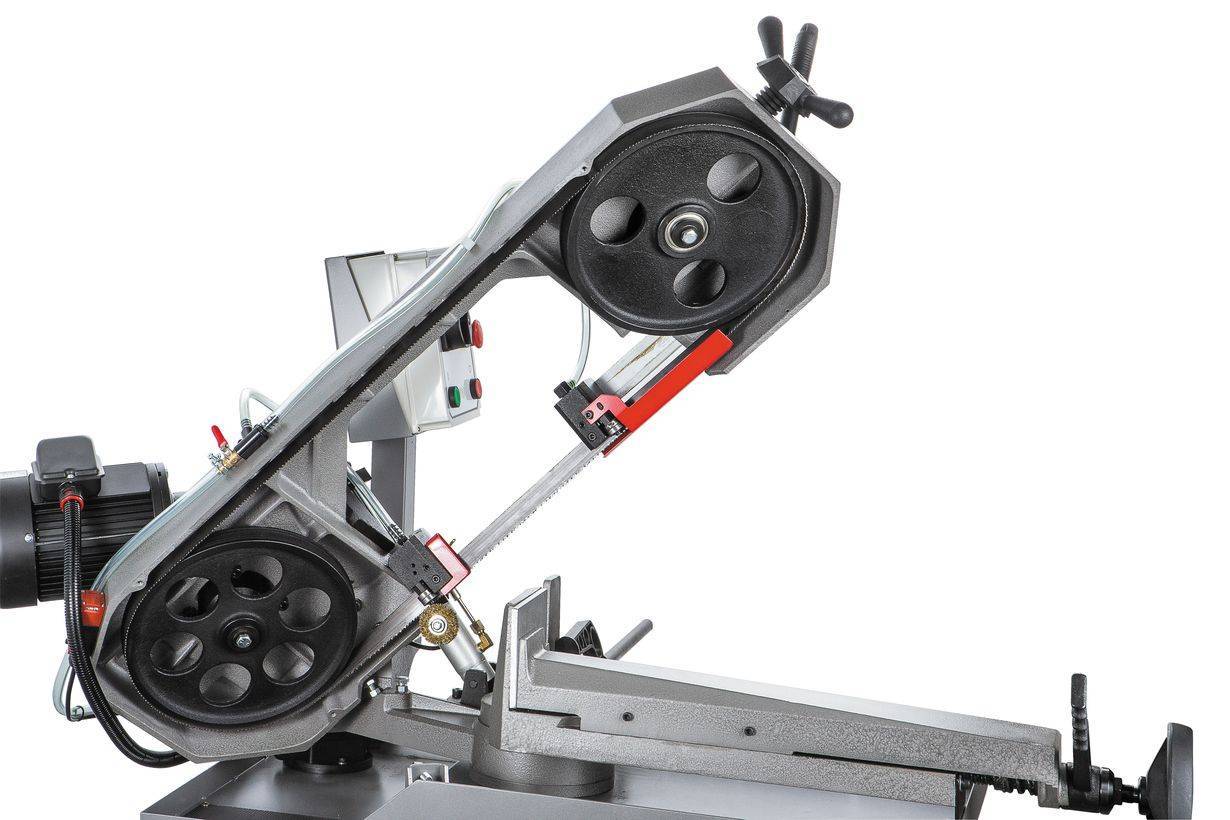 Ленточнопильный станок оборудован быстрозажимными тисками, используя которые можно добиться высокой производительности работ. Консоль станка имеет направляющие, передвижение которых позволяет регулировать проход ленточного полотна, повысить качество распила и ограничить уводку полотна в сторону. Направляющие оснащены подшипниками выполняющими функцию позиционирования ленточного полотна в вертикальном положении относительно обрабатываемой заготовки. Станок имеет тензометр, фиксирующий силу натяжения ленточного полотна. Регулировка силы натяжения осуществляется вручную.