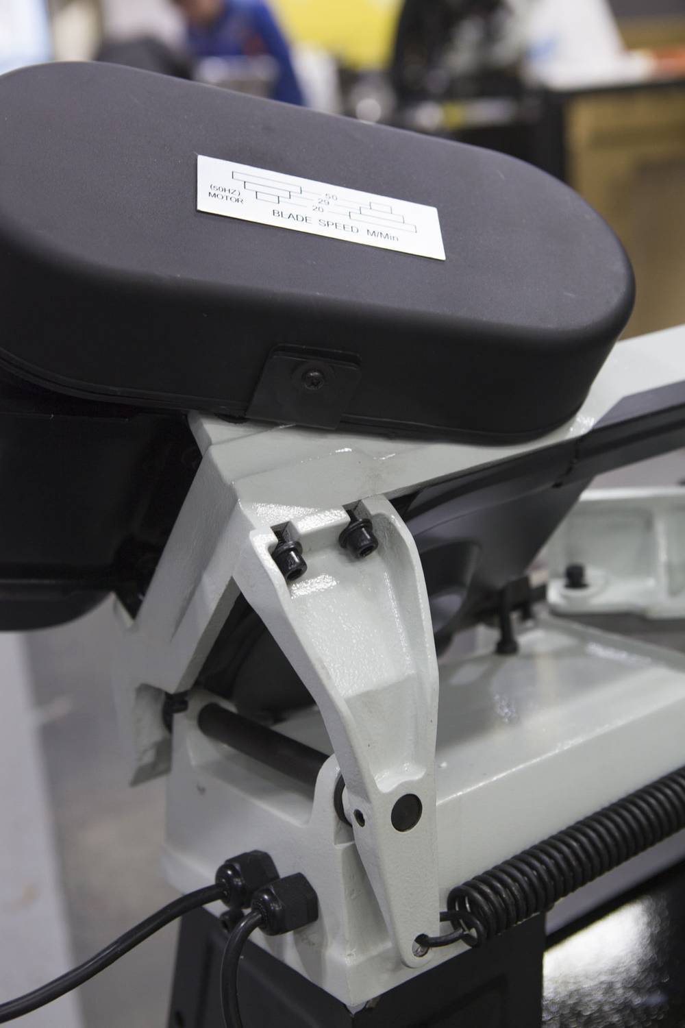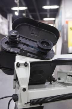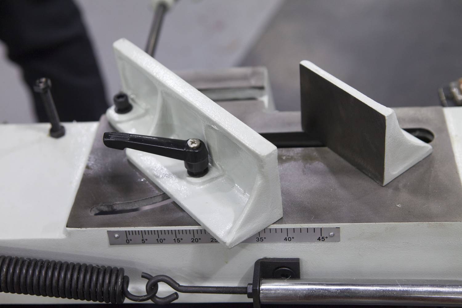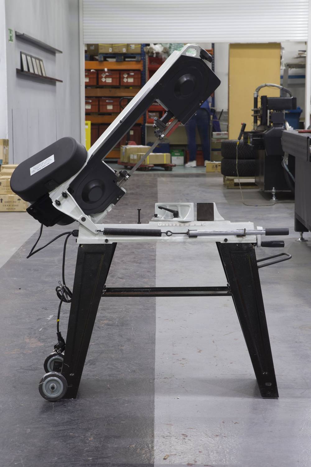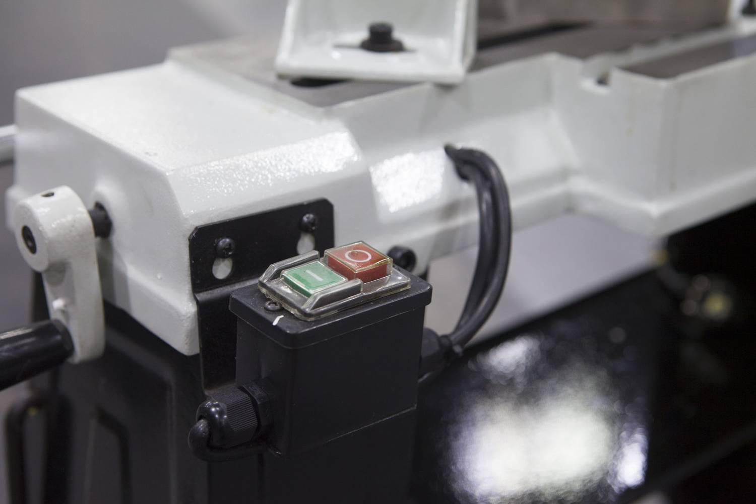 Станок оснащен ременной передачей, поворотными тисками с углом наклона 45-90 градусов, устойчивой конструкцией с транспортировочными колесами, ограничителем длины реза, регулировкой натяжения пильного полотна, дополнительным столом при резке плиты в вертикальном положении рамы.