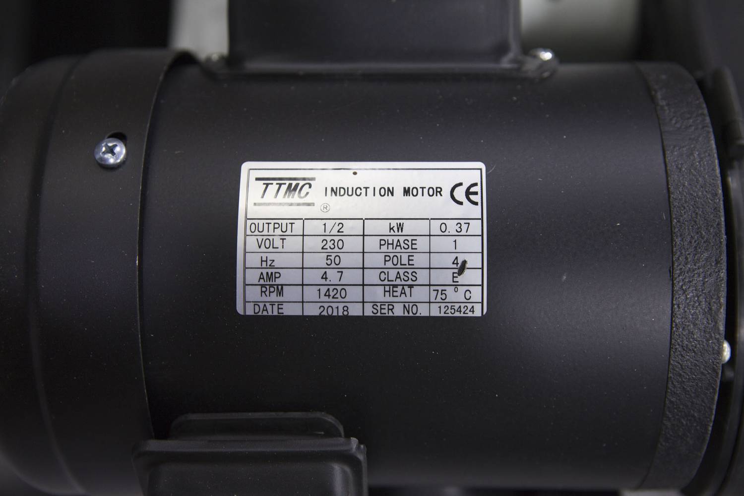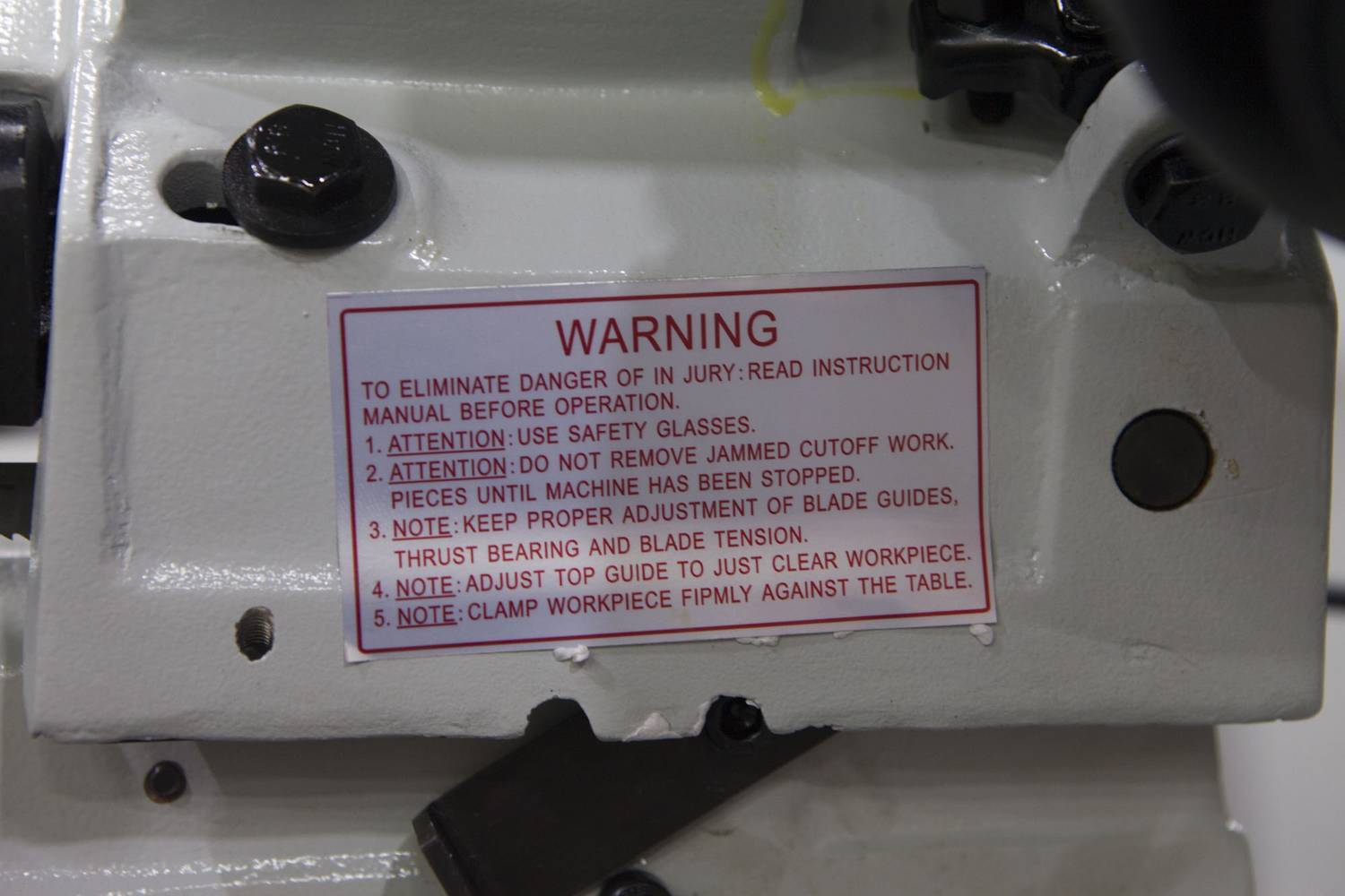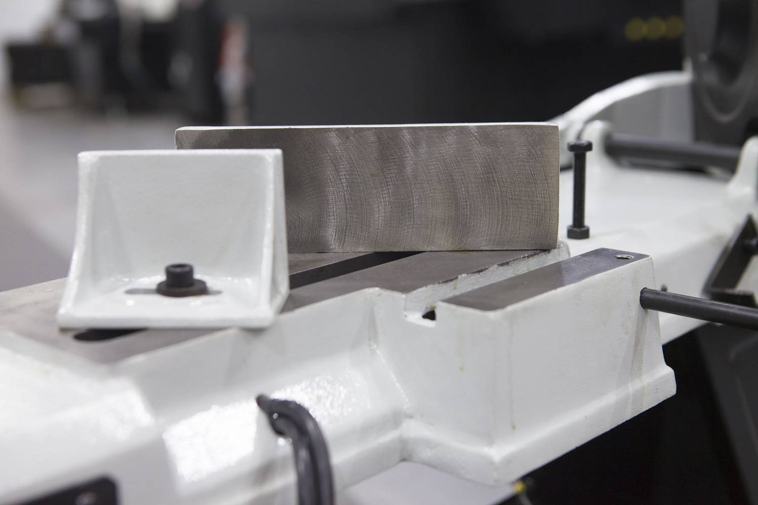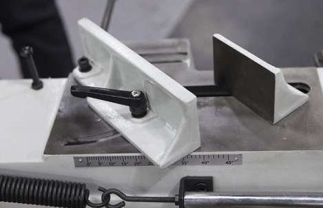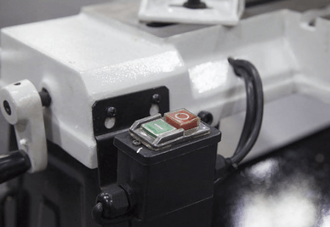 Станок оснащен ременной передачей, поворотными тисками с углом наклона 45-90 градусов, устойчивой конструкцией с транспортировочными колесами, ограничителем длины реза, регулировкой натяжения пильного полотна, дополнительным столом при резке плиты в вертикальном положении рамы.