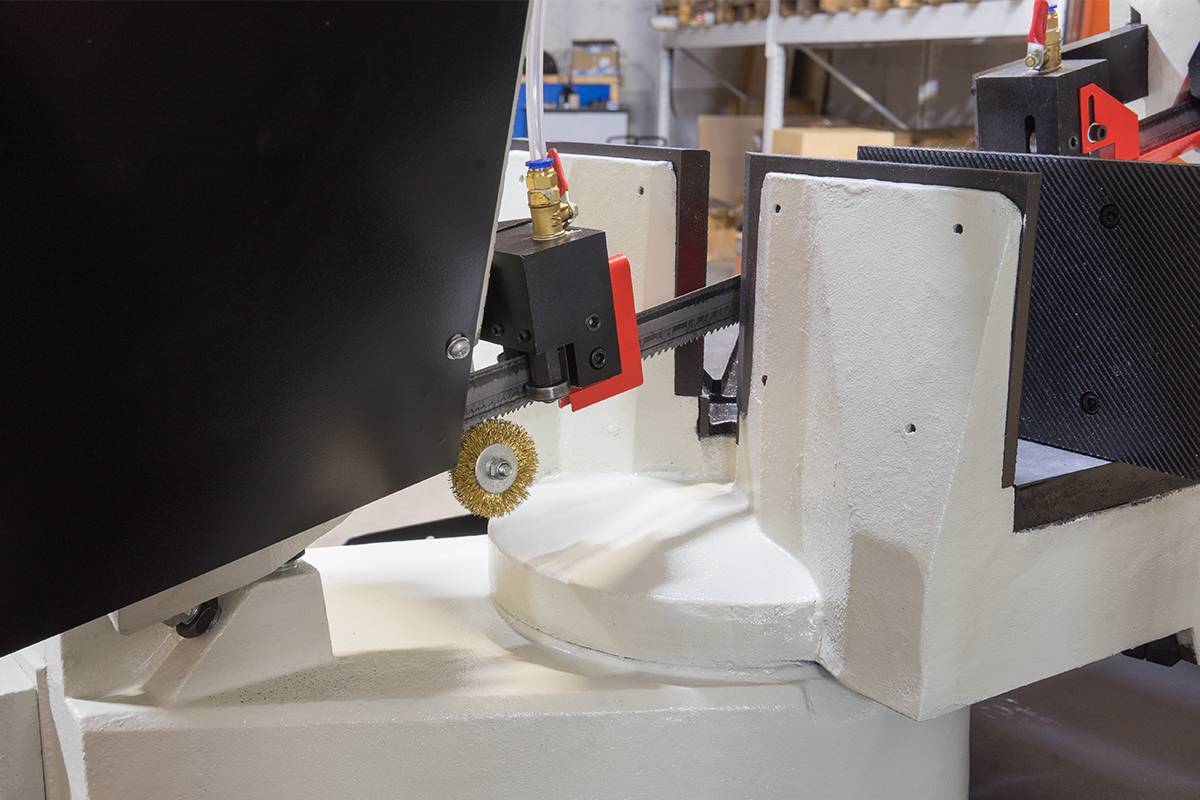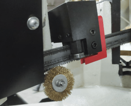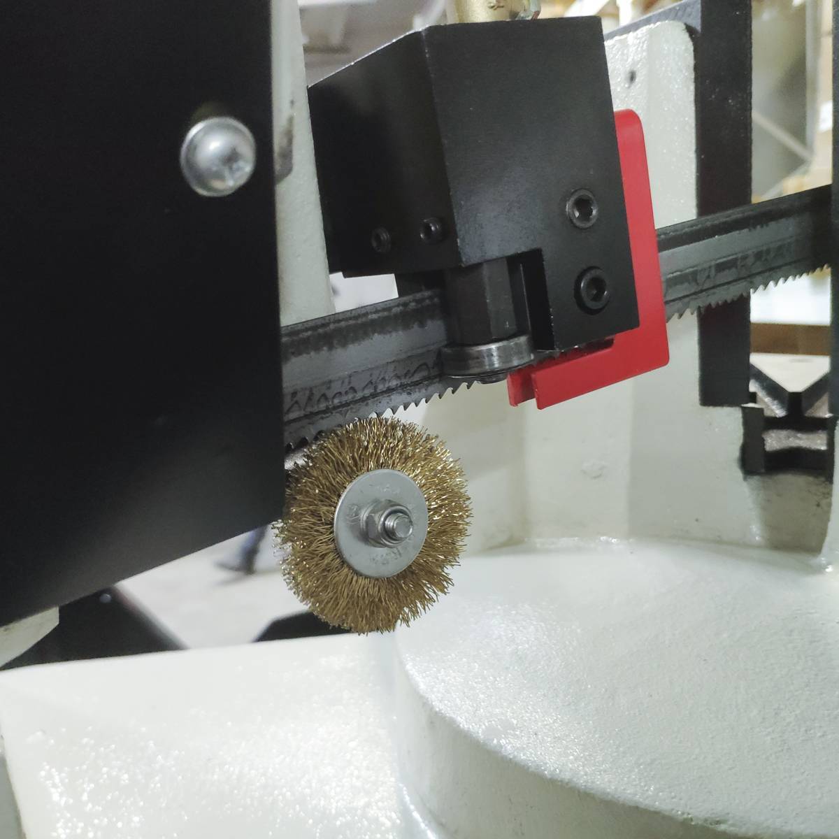 Механическая дисковая щётка (приводимая в движение от движения полотна). Зубчатый блок, с твёрдосплавными платинами и подшипниками для выпрямления полотна в зоне резания и качественной фиксации для стабильного пиления. |