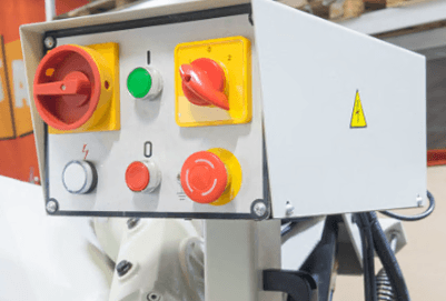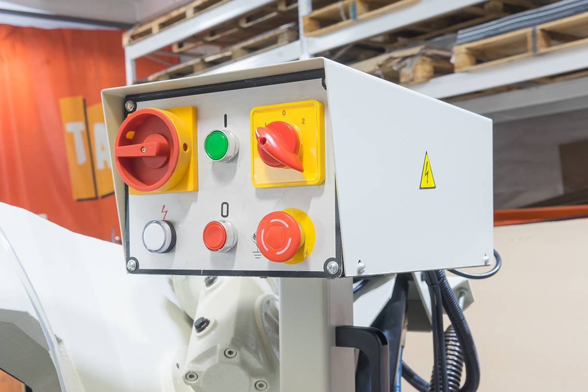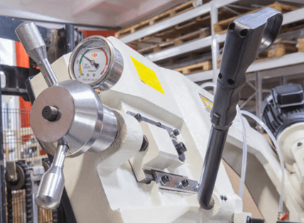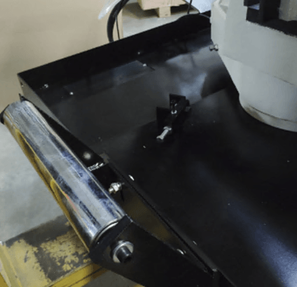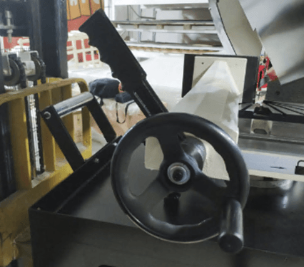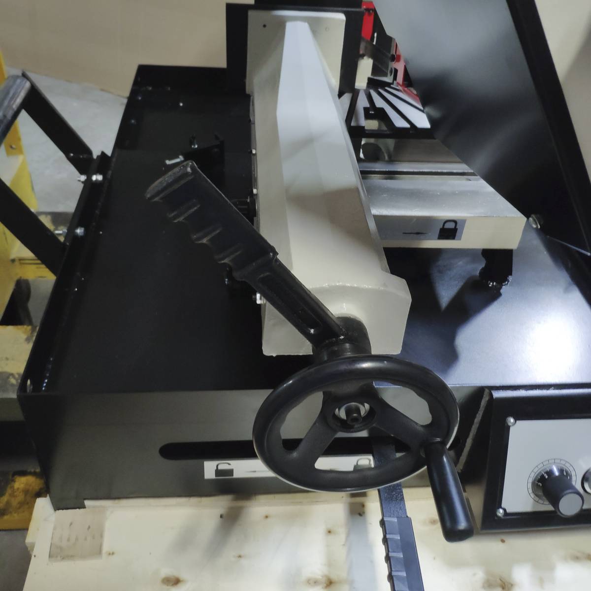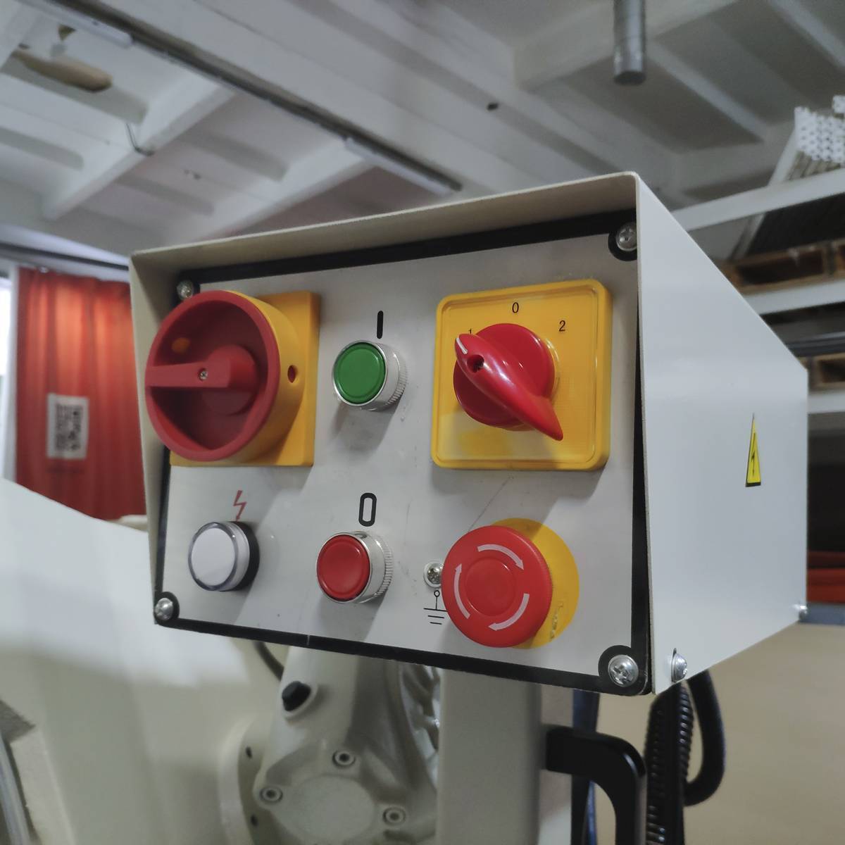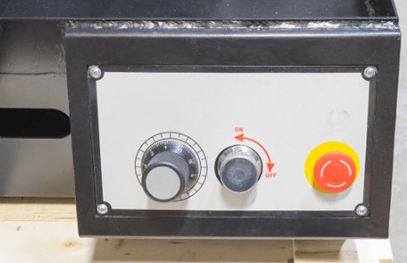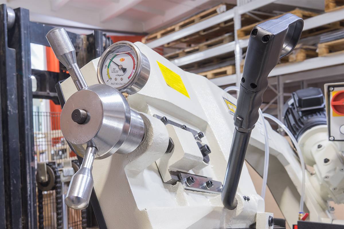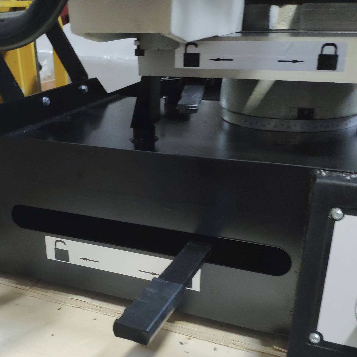 На тумбе станка размещены маховики регулировки скорости опускания рамы и дублирующая кнопка экстренного выключения. |