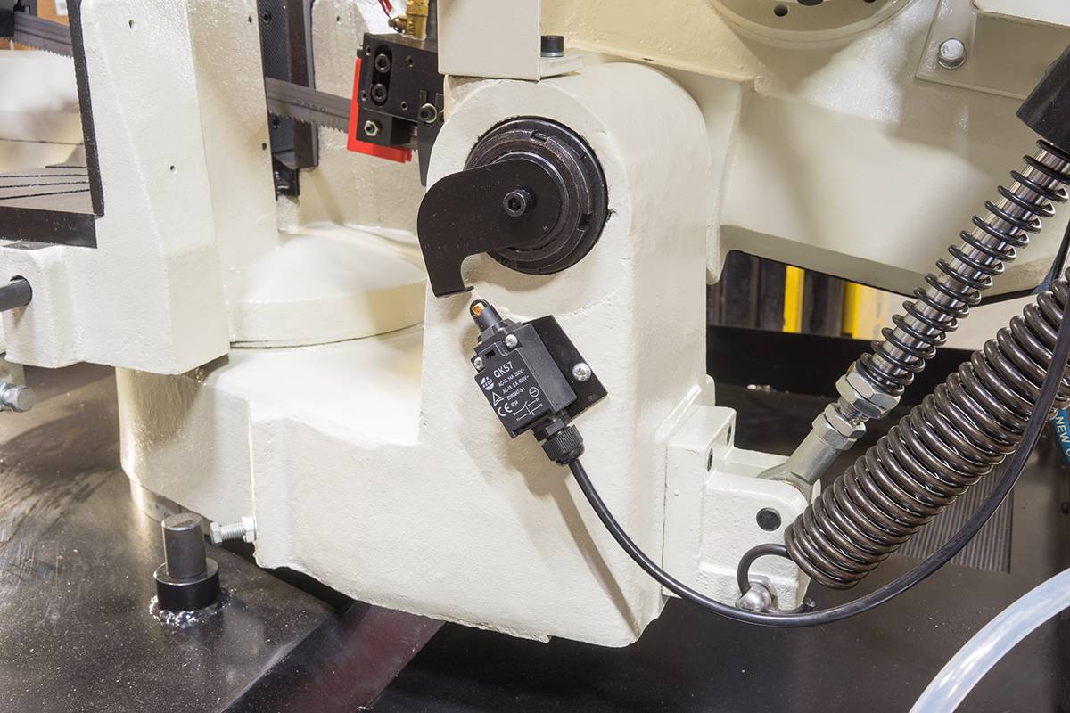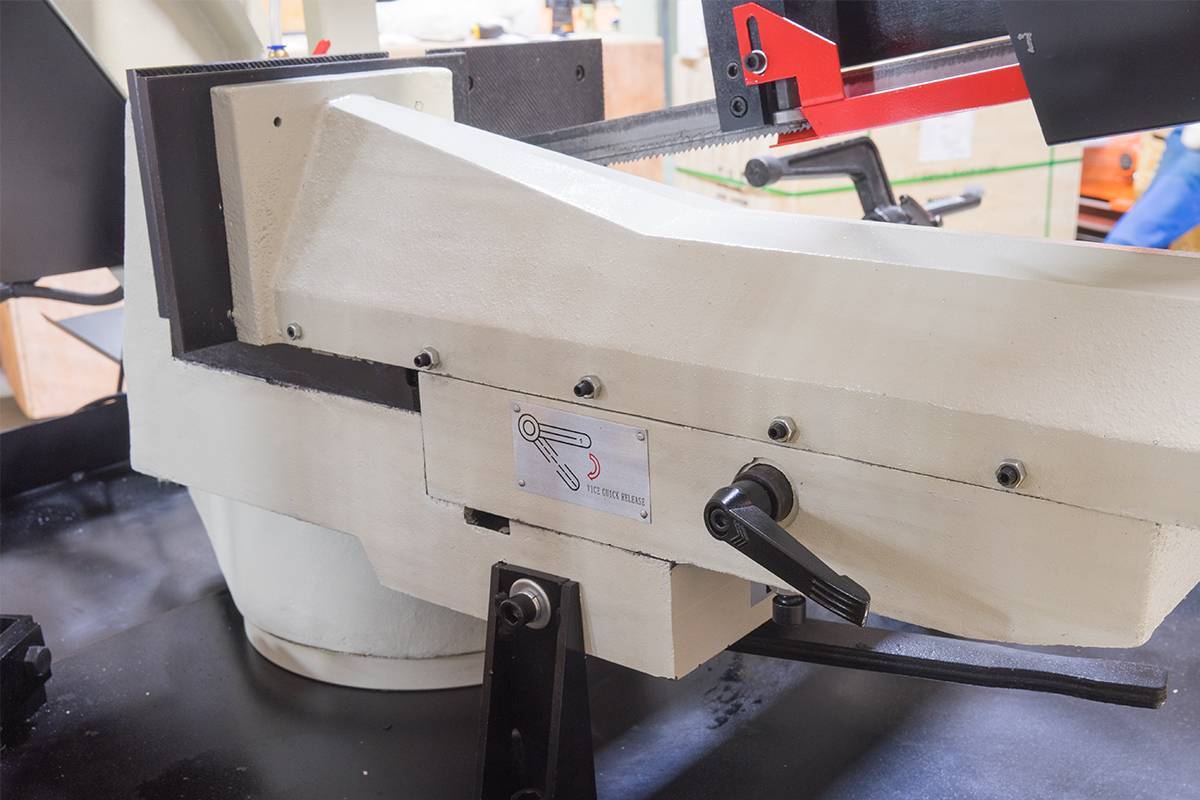 Используя данную модель имеющую быстро регулируемые тиски для резки под углом, поворачивается рама, а не заготовка. Тиски с системой быстрого отвода ускоряют процесс смены заготовки (ускоренный отвод подвижной губки происходит без вращения маховика). Зажим заготовки осуществляется тисками вручную, подача заготовки - также вручную. Наличие система СОЖ в стандартной комплектации – позволяет добиться высокой производительности.