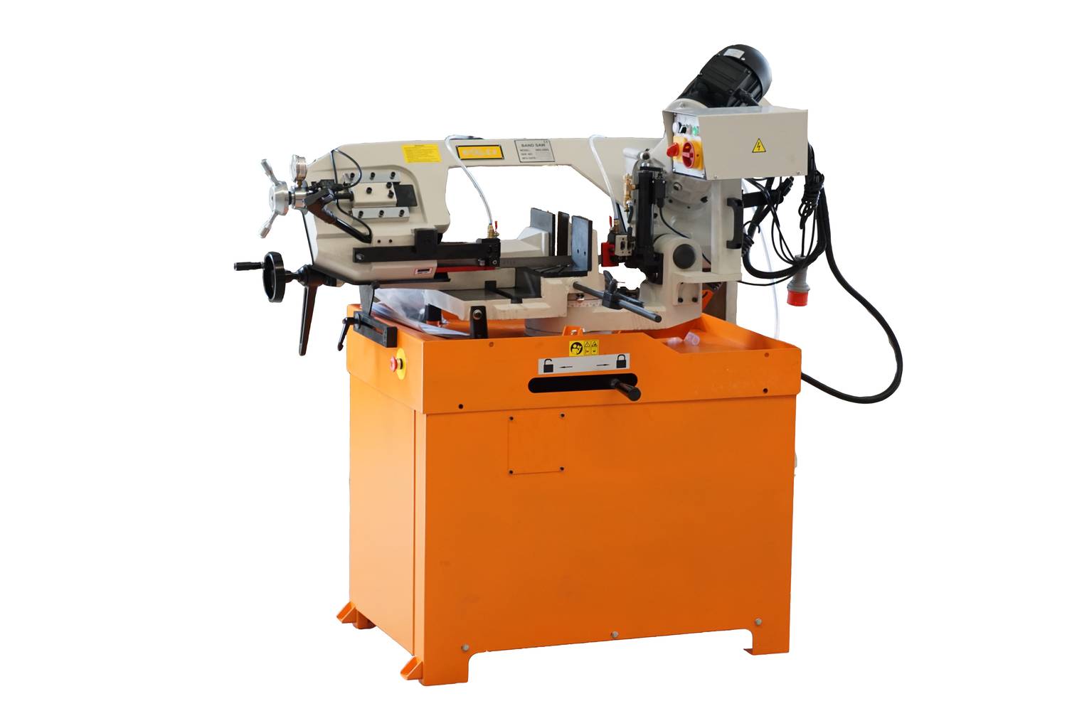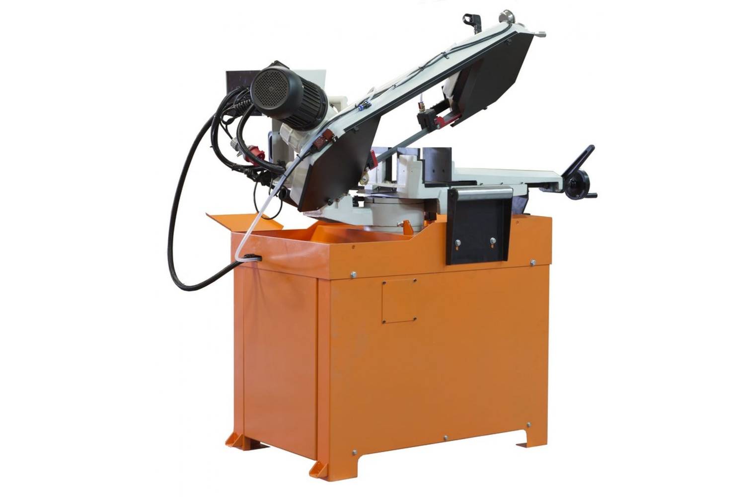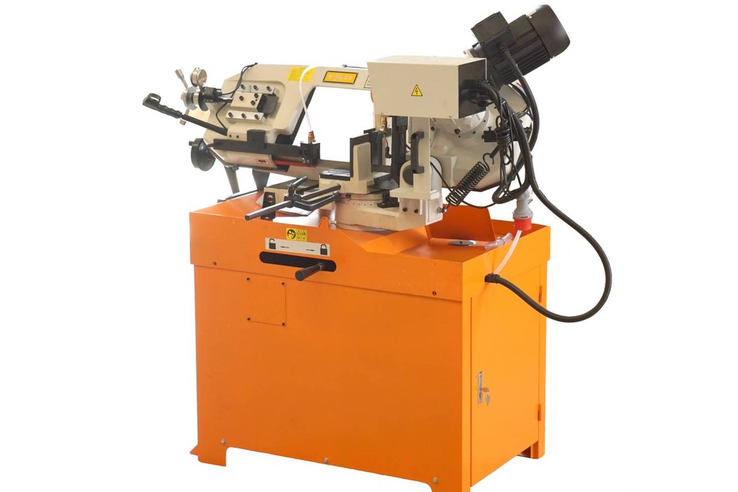 Используя данную модель имеющую быстро регулируемые тиски для резки под углом, поворачивается рама, а не заготовка. Тиски с системой быстрого отвода ускоряют процесс смены заготовки (ускоренный отвод подвижной губки происходит без вращения маховика). Зажим заготовки осуществляется тисками вручную, подача заготовки - также вручную. Наличие система СОЖ в стандартной комплектации – позволяет добиться высокой производительности.