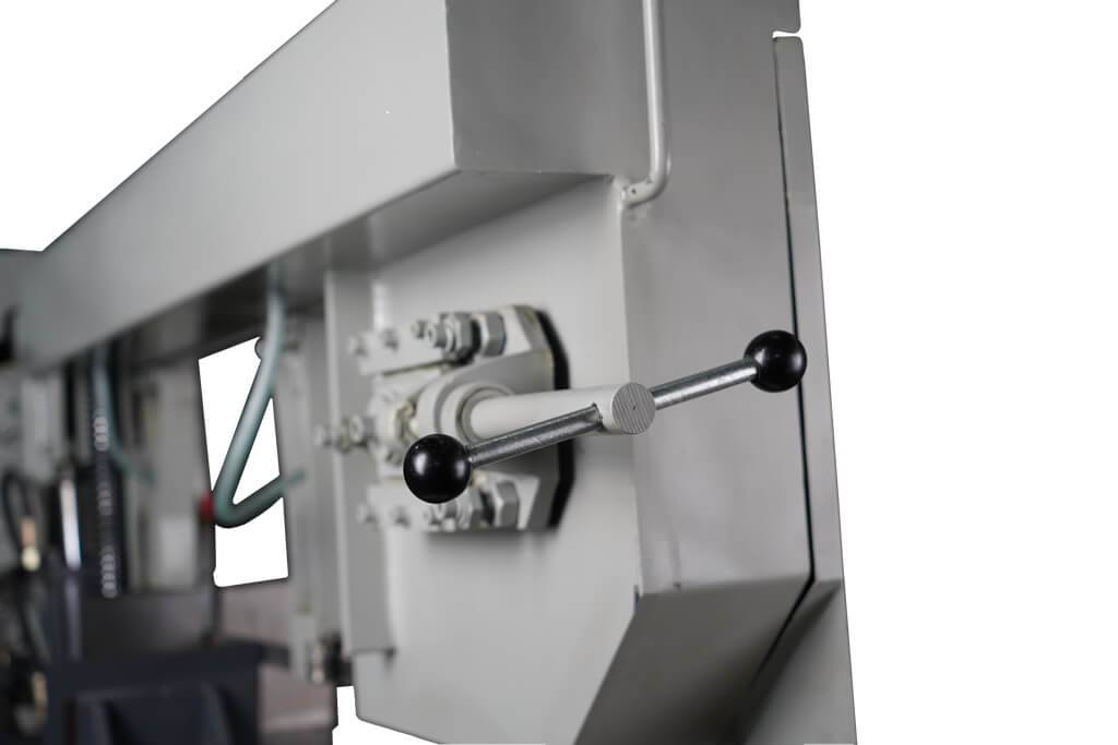 За надежное закрепление заготовки на станке отвечают ручные механические тиски с гидравлическим поджимом. Зажимная губка тисков имеет возможность перемещения по оси Y с помощью вращения маховика, данная функция используется для резки заготовок под отрицательным углом.