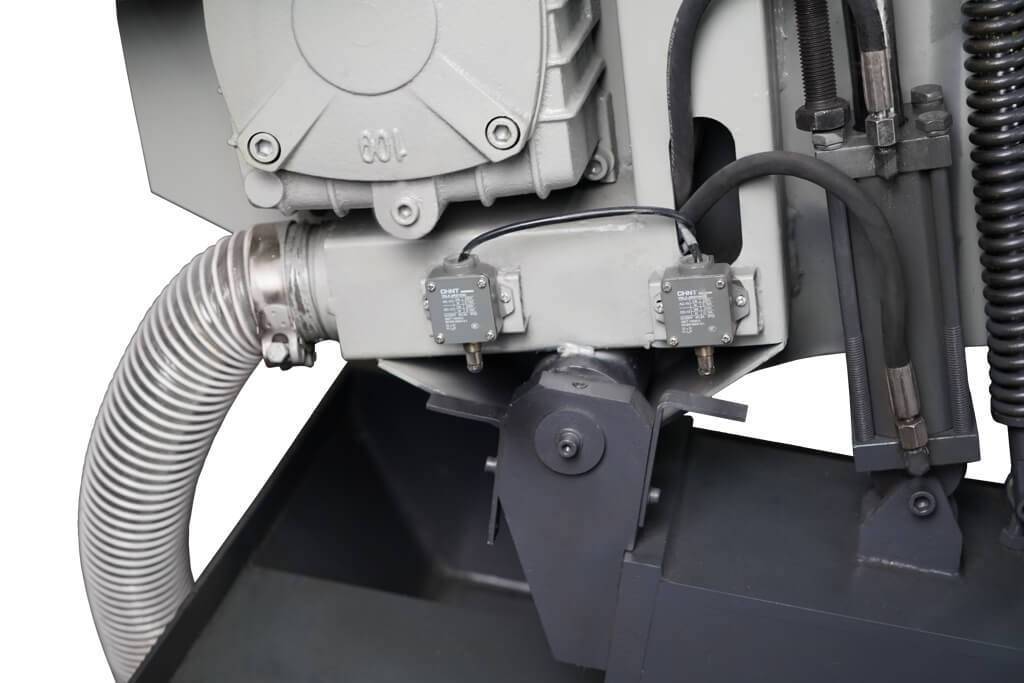 Пильная рама поднимается и опускается за счет мощного гидроцилиндра. Поднятие и опускания осуществляется кнопками на панели управления. Высоту поднятия рамы после окончания распила можно отрегулировать с помощью смены положения концевых выключателей.