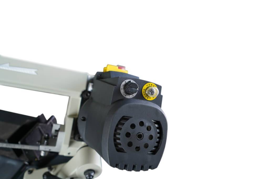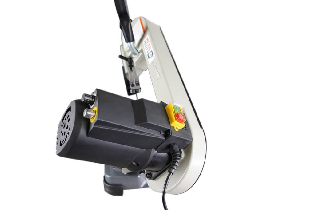 Включение/выключение вращения ленточнопильного полотна осуществляеться с помощью кнопки расположеной на рукоятке станка.