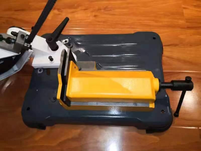 Данная модель оснащена стационарными тисками, для резки под углом, поворачивается рама, а не заготовка. Зажим заготовки осуществляется тисками вручную, за счет вращения маховика, подача заготовки - также вручную.