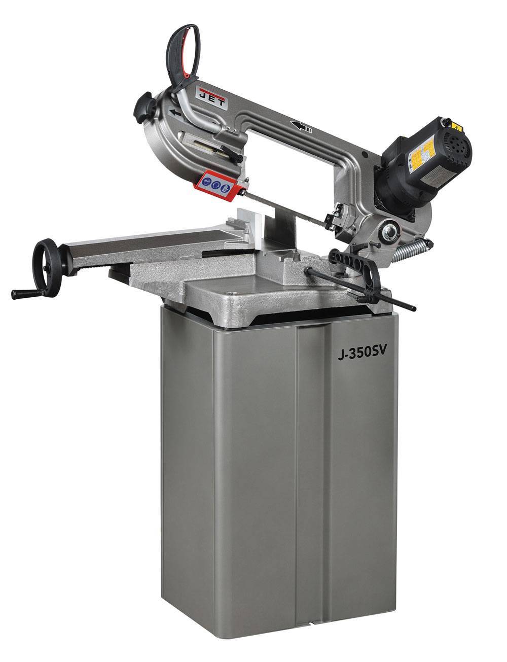 Главное отличие станка JET J-350SV от станка JET J-350V – это наличие тумбы, на которую установлен сам станок. Она идет в стандартной комплектации. Станок оснащен мощным двигателем, что позволяет с легкостью пилить заготовки в прямоугольном сечении 150х140 мм. Плавная регулировка скорости пильного полотна позволит правильно подобрать режим. Отличный станок как для частного использования в строительстве, так и для работы на выездных площадках. Полотно шириной 20 мм, правильная натяжка и подшипники, направляющие пильное полотно, прекрасно сохранят перпендикулярность реза.
