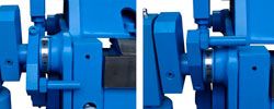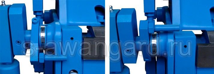 Подъем прижимной баки осуществляется за счет движения эксцентрика, что обеспечивает высокую скорость подъема балки и высокую производительность станка. Сила прижима заготовки удобно и просто регулируется. Раскрытие балки осуществляется ее поворотом вокруг горизонтальной оси.