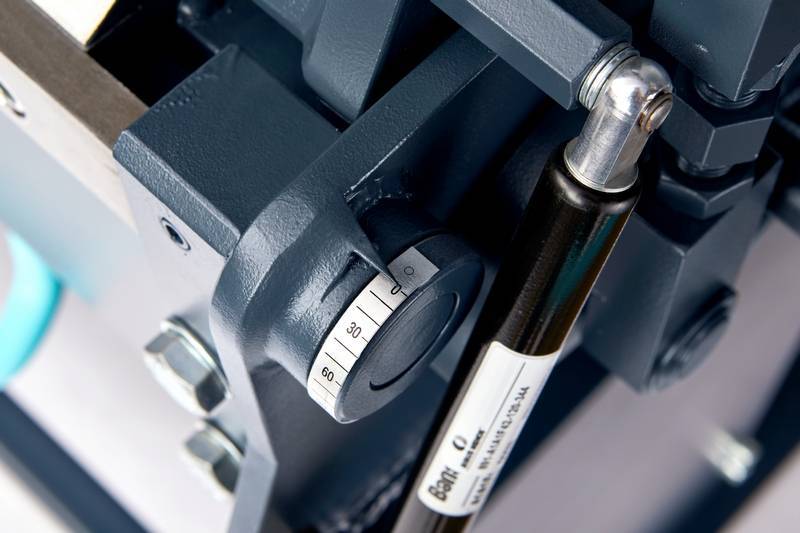 Гибочная балки снабжена угломером. Это позволяет производить изделия с точно заданным углом гиба. Входящий в комплект станка ограничитель поворота гибочной балки обеспечит высокую воспроизводимость угла гиба и облегчит изготовление большого количества одинаковых изделий.