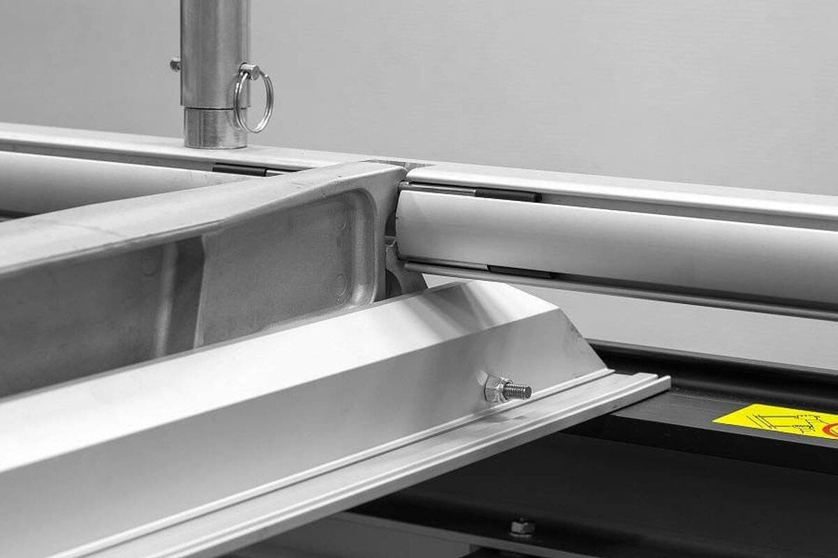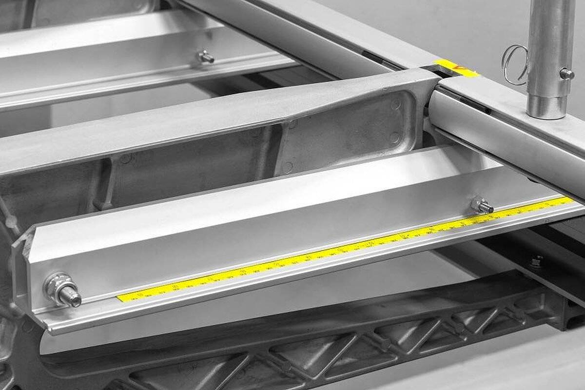Изготовлена из усиленного алюминиевого профиля. В конструкции предусмотрен «рельс» для роликового ножа и установки угломеров. Кромка планки имеет радиус всего 2мм и дополнительно защищена от повреждения стальным уголком.