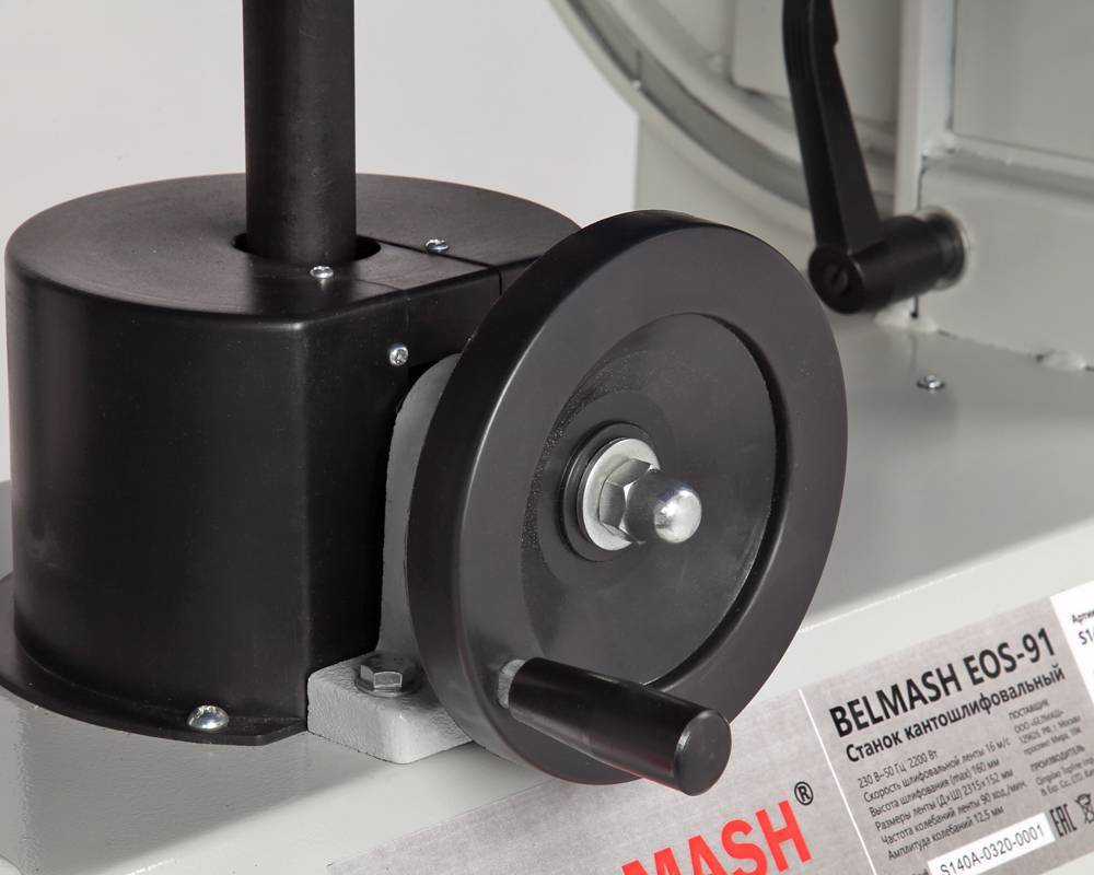 Конструктивно он представляет собой шлифовальный блок с приводом и двумя рабочими столами, размещенными на основании. У ленточного блока предусмотрена регулировка угла наклона от 0 до 90 градусов. Рассчитан на подключение к сети 400 В. Имеется аналогичная модель BELMASH EOS-91 для подключения к электросети 230 В;