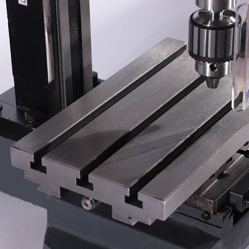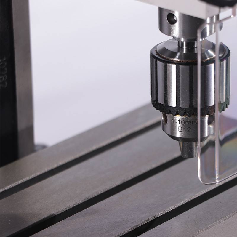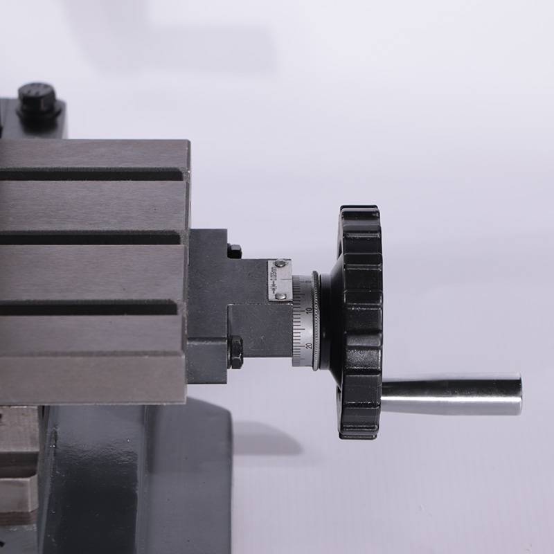 Привод мини фрезерного станка обеспечивается коллекторным двигателем с постоянными магнитами. Диапазоны оборотов выбираются с помощью двухскоростной коробки передач (H и L). Плавная регулировка скорости вращения шпинделя обеспечивает потенциометр, благодаря которому можно установить любую скорость вращения в выбранном диапазоне.