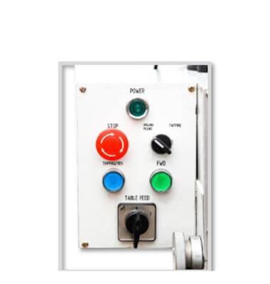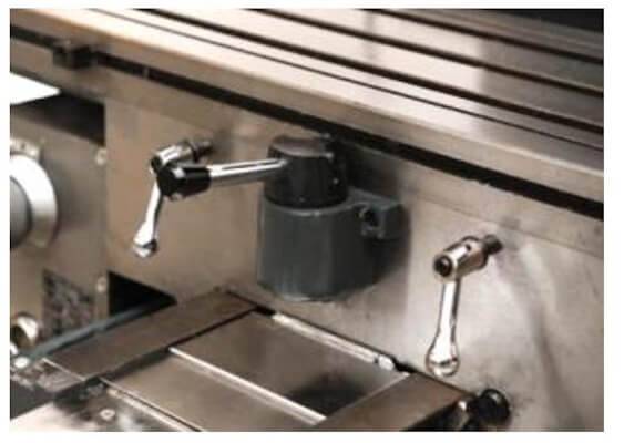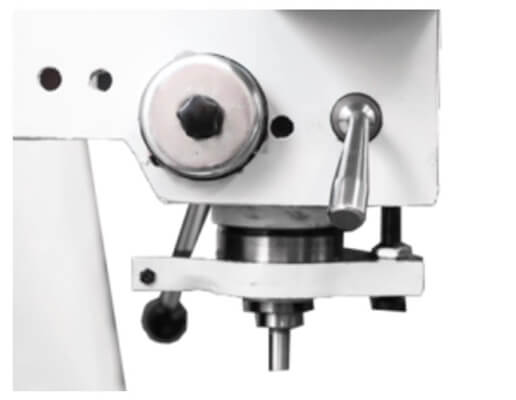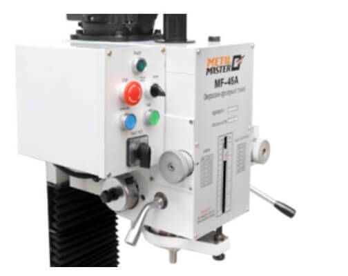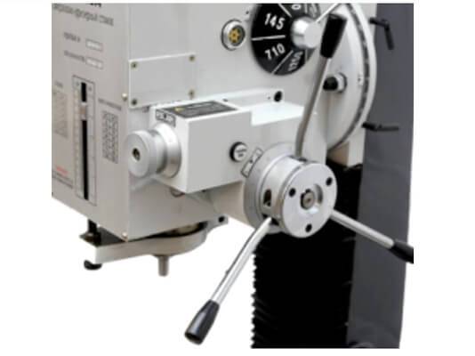 Вертикальный шпиндель снабжен звездчатой рукояткой, с ее помощью возможно переключение на ручной режим (быстрая подача при сверлении) и автоматический (медленной подачи при фрезеровании).