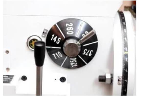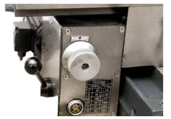 Перемещение стола по оси X производится электродвигателем. Требуемая скорость движения задается положением ручек. Таблица соответствия скоростей подачи положению ручек расположена прямо на коробке передач.