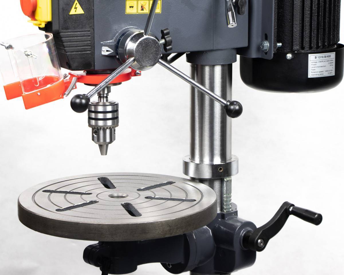 Сверлильный станок на стойке В-1316В/400 предназначен для сверления отверстий в металле, пластике, дереве и других материалах. В условиях мелко-среднесерийного и крупного производства настольный сверлильный станок B-1316B/400 находит широкое применение за счет своей многофункциональности, мощности и высокой производительности. Станок может быть использован практически в любых условиях — он работает от трёхфазной сети, имеет небольшие размеры и отличается невысокой потребляемой мощностью. Возможности станка расширены благодаря функциями поворота и наклона стола. Для удобства при эксплуатации станок оснащен отличной подсветкой рабочей зоны. Кроме того, настольный сверлильный станок имеет защитный экран, который обеспечивает дополнительную защиту и при этом не закрывает обзор.