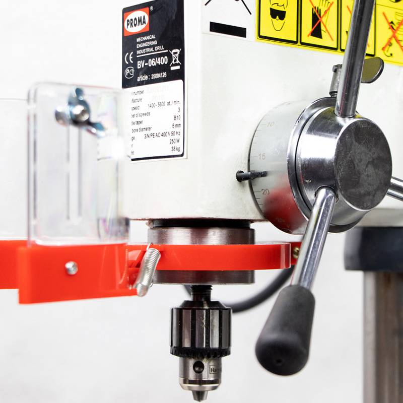 Станок BV-06/400 PROMA применяет для получения отверстий в изделиях из металла. Может использоваться как для сверления, так и для обработки имеющихся отверстий, если диаметр чересчур мал для использования в определенных целях. Использование устройства возможно и в небольшой мастерской, и на крупном предприятии. Диаметр высверливания отверстий – не более 6 мм. Для смены оборотов сверла задействуют клиновой ремень.