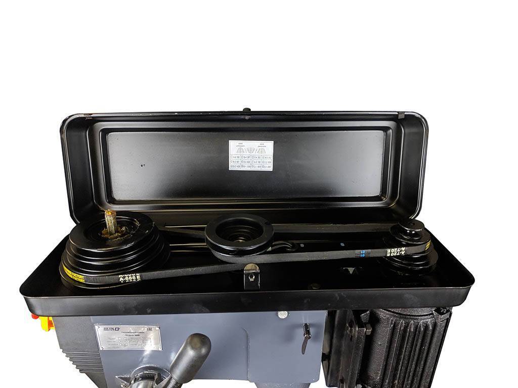 Скорость вращения шпинделя регулируется с помощью перекидывания ремней в блоке ременных шкивов. Схема расположения ремней с диапазоном оборотов расположена под защитной крышкой кожуха.