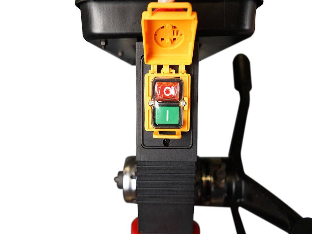 На лицевой стороне сверлильной головы расположены кнопки включения и выключения станка с крышкой, которая также используется как аварийный выключатель.
