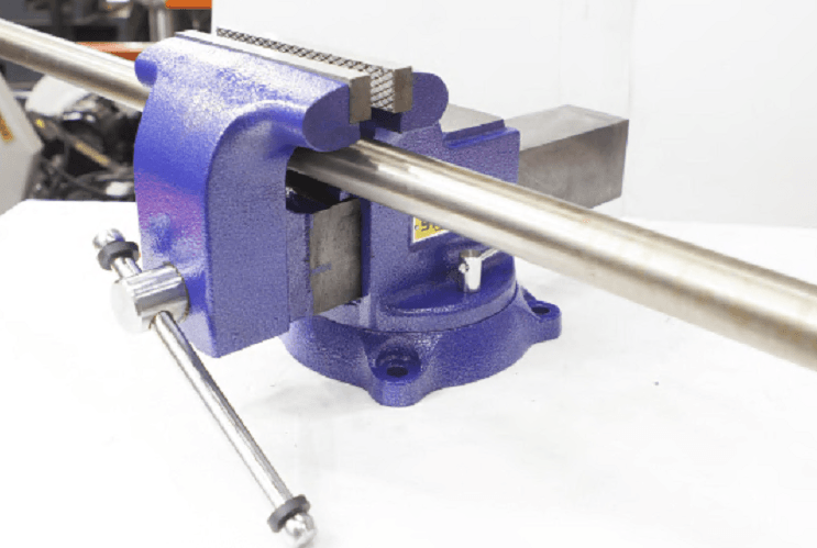 Закрытый ходовой винт тисков защищен от попадания металлической стружки и опилок. Тиски имеют возможность поворота на 360° относительно своего основания.