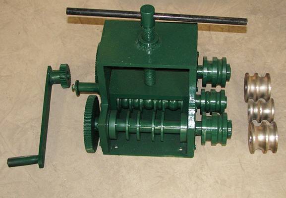 На ТР-07 можно работать с профильными трубами от 15 до 40 мм. В комплект станка входят ролики для круглой трубы диаметром 20, 25, 30 мм. Для прокатки полосы «на ребро» 20х4 мм. Конструктивная особенность этого трубогиба: два нижних ведущих вала. На ручке вращающей приводной механизм есть малая шестерня, которая передает вращение ручки на две большие шестерни нижних валов. Этот приводной шестеренчатый механизм существенно облегчает работу. Также его можно использовать, если вы захотите присоединить к трубогибу мотор-редуктор.