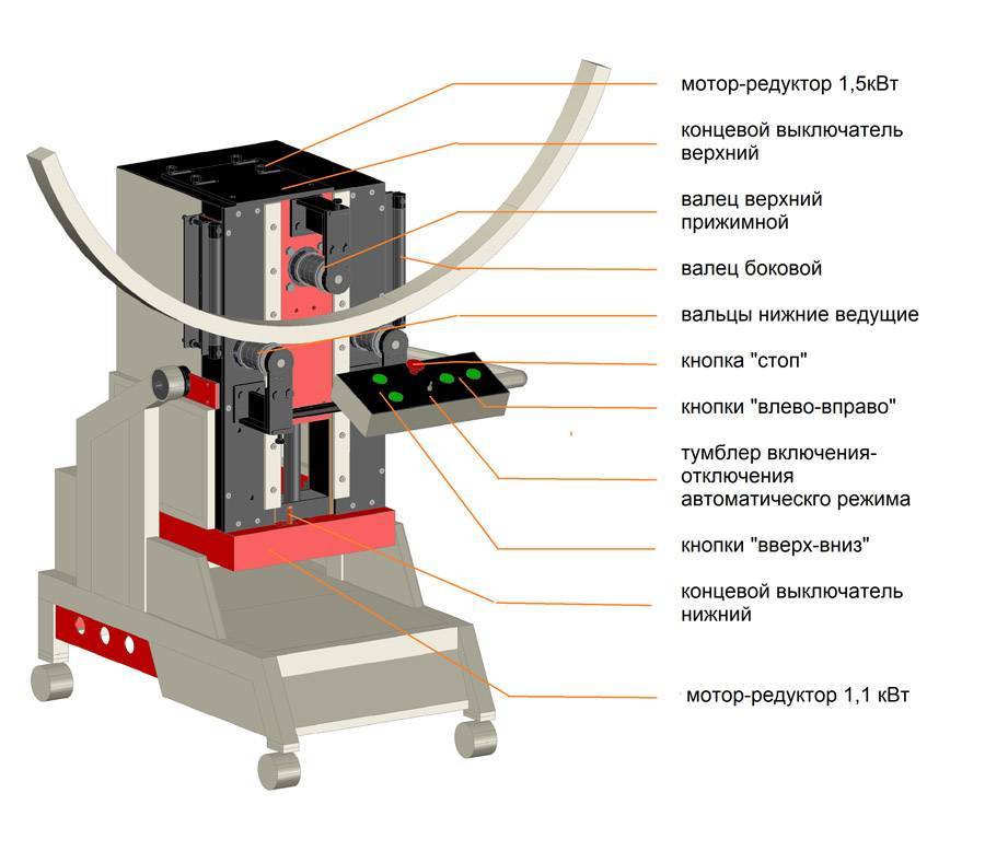 Станок оборудован двумя мотор-редукторами 380В мощностью 1,1 кВт (прижим) и 1,5 кВт (прокатка).