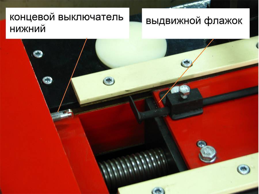 - концевые выключатели. верхний не регулируется, нижний с регулировкой положения остановки прижимной каретки.
