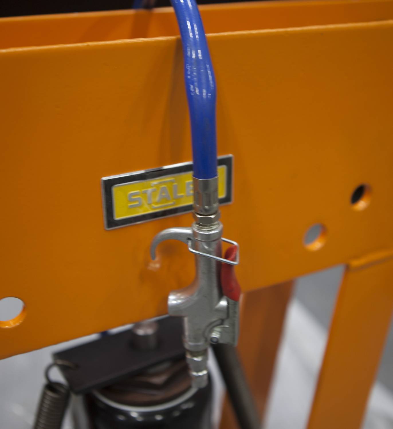 Модель Stalex HB-16Q продавливает заготовки при помощи гидравлической направляющей, работая в двух независимых друг от друга режимах (ручной и пневматический), с набором сменных рабочих оправ. Помимо восьми рабочих опор станок имеет две горизонтальные опоры, устанавливаемые в отверстия для регулировки радиуса гиба.