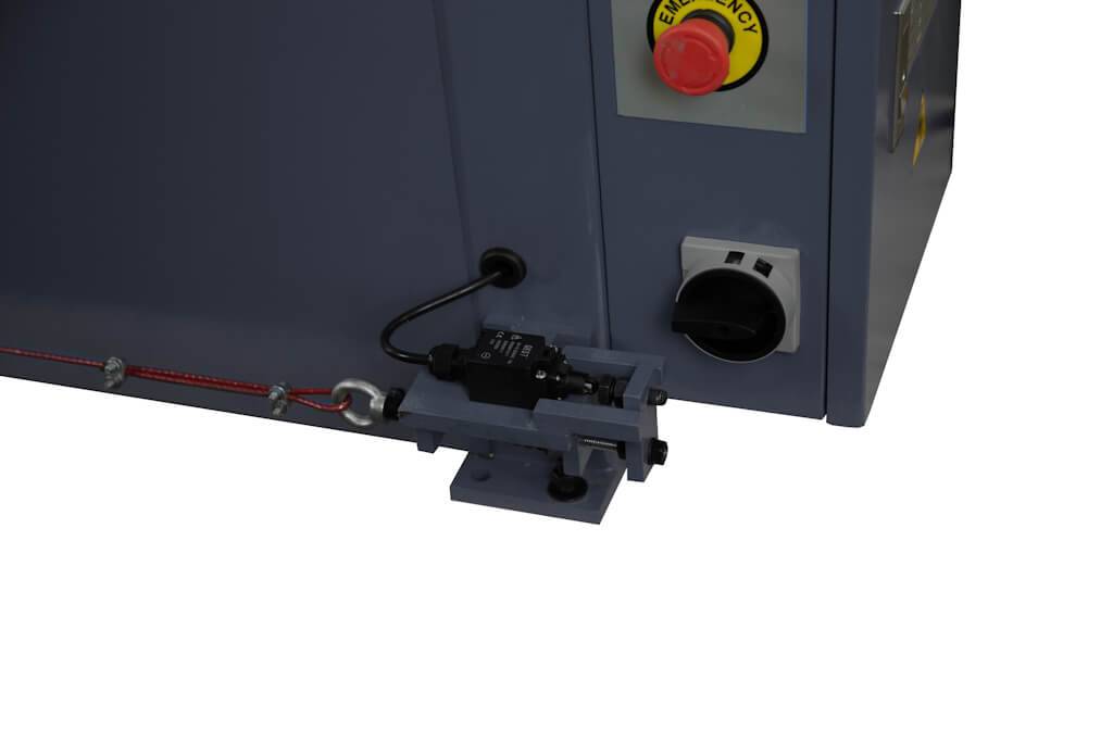 Дополнительная кнопка «аварийный стоп» расположена на передней поверхности электрического шкафа. Там же находится основной выключатель и кнопки включения/выключения машины, а так же индикатор сети и индикатор «работа». Спереди, внизу на станине установлен тросовый выключатель для аварийной остановки валов. Слева, под защитным кожухом находится цепная передача и шестеренный механизм привода валов.