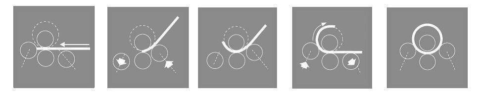 • Зажим заготовки осуществляется средними валками, сгибание листа происходит под действием специальных боковых вальцов