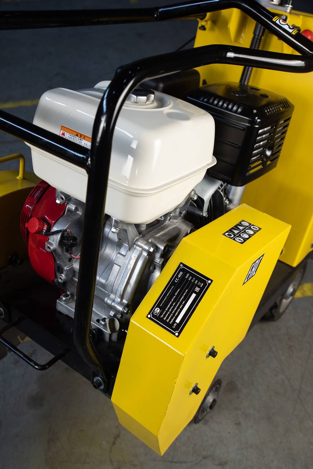 Резчик швов TOR CC-400 (Honda) оснащен надежным бензиновым четырёхтактным двигателем Honda GX390 (13л.с.). Диаметр, используемых дисков от 400 до 450 мм позволяет достигать глубину реза 130 мм. Встроенная система подачи воды снижает образование пыли при проведении работ и охлаждает диск, продляя его срок службы. Настраиваемая высота рукояти обеспечивает комфортную работу оператора.